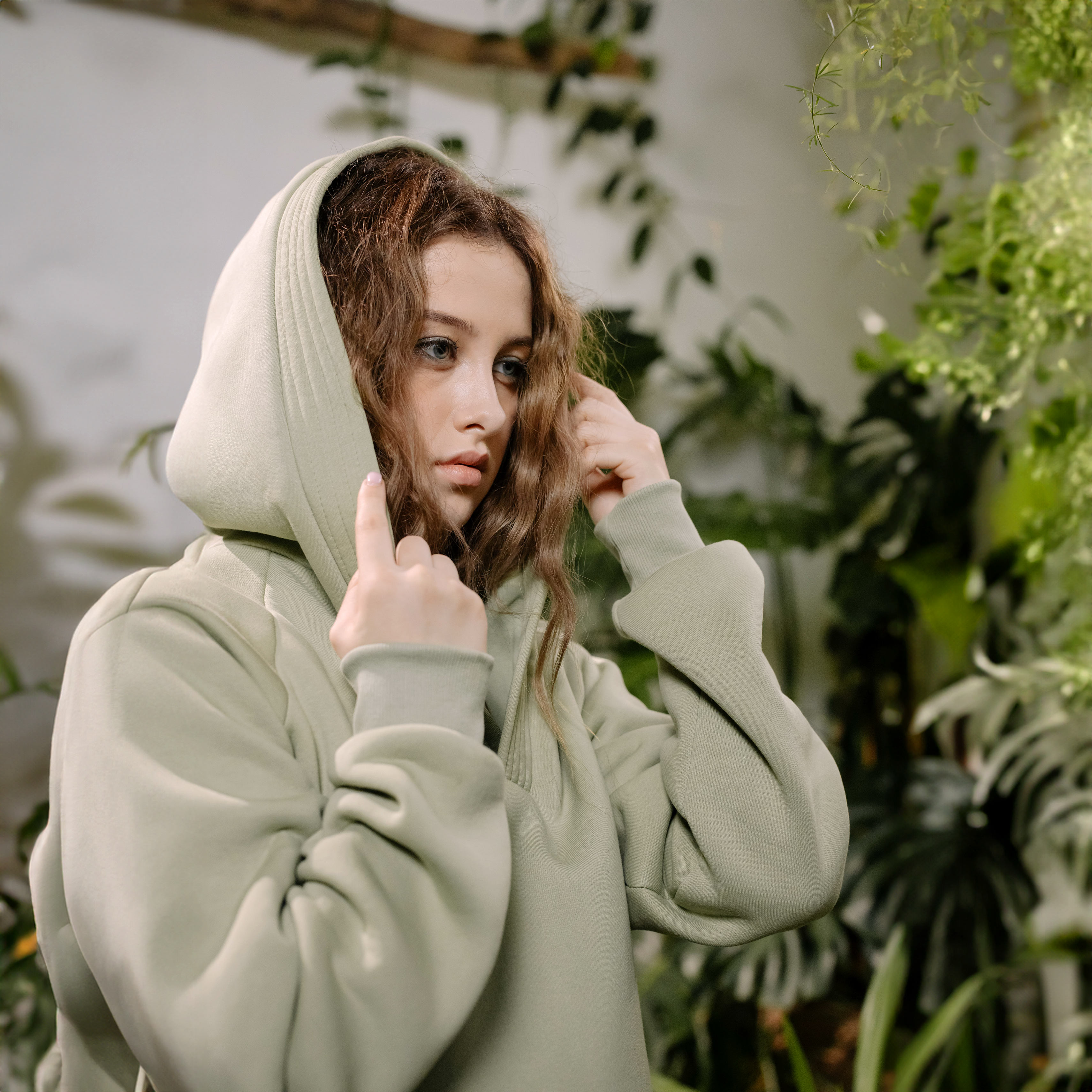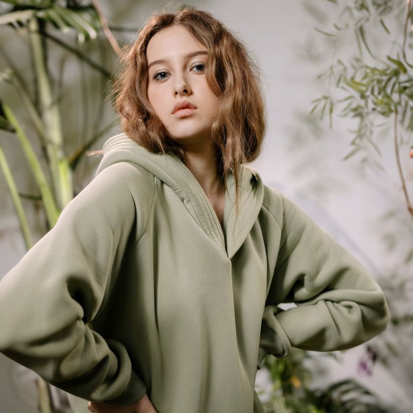 - Oversized, relaxed fit with hood and long sleeves