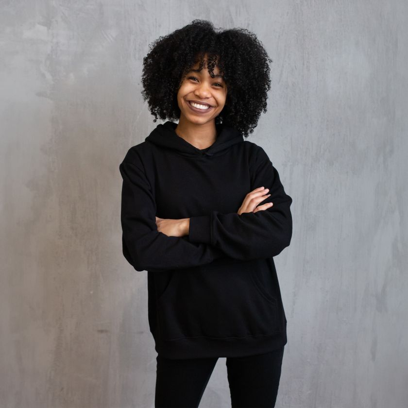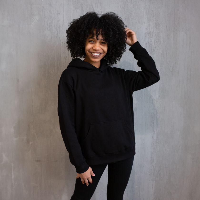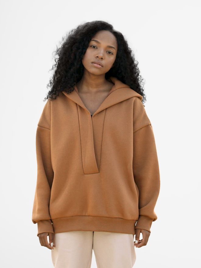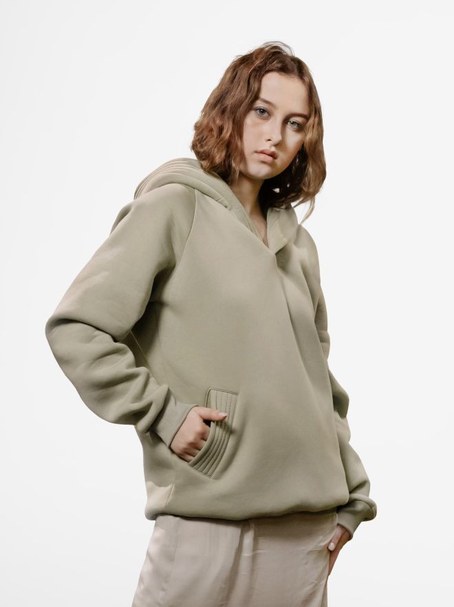 - Oversized, relaxed fit with hood and long sleeves
